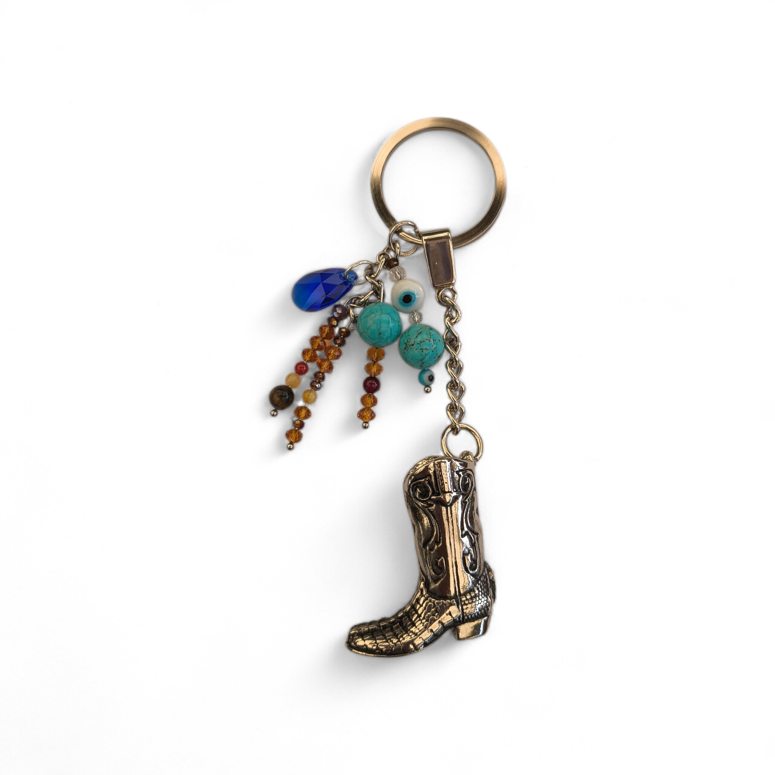 Un accesorio con alma rural y carácter auténtico. Su bota vaquera metálica se combina con cristales de Murano, toque de ámbar, turquesas vibrantes, Swarovski azul y ojo turco protector.